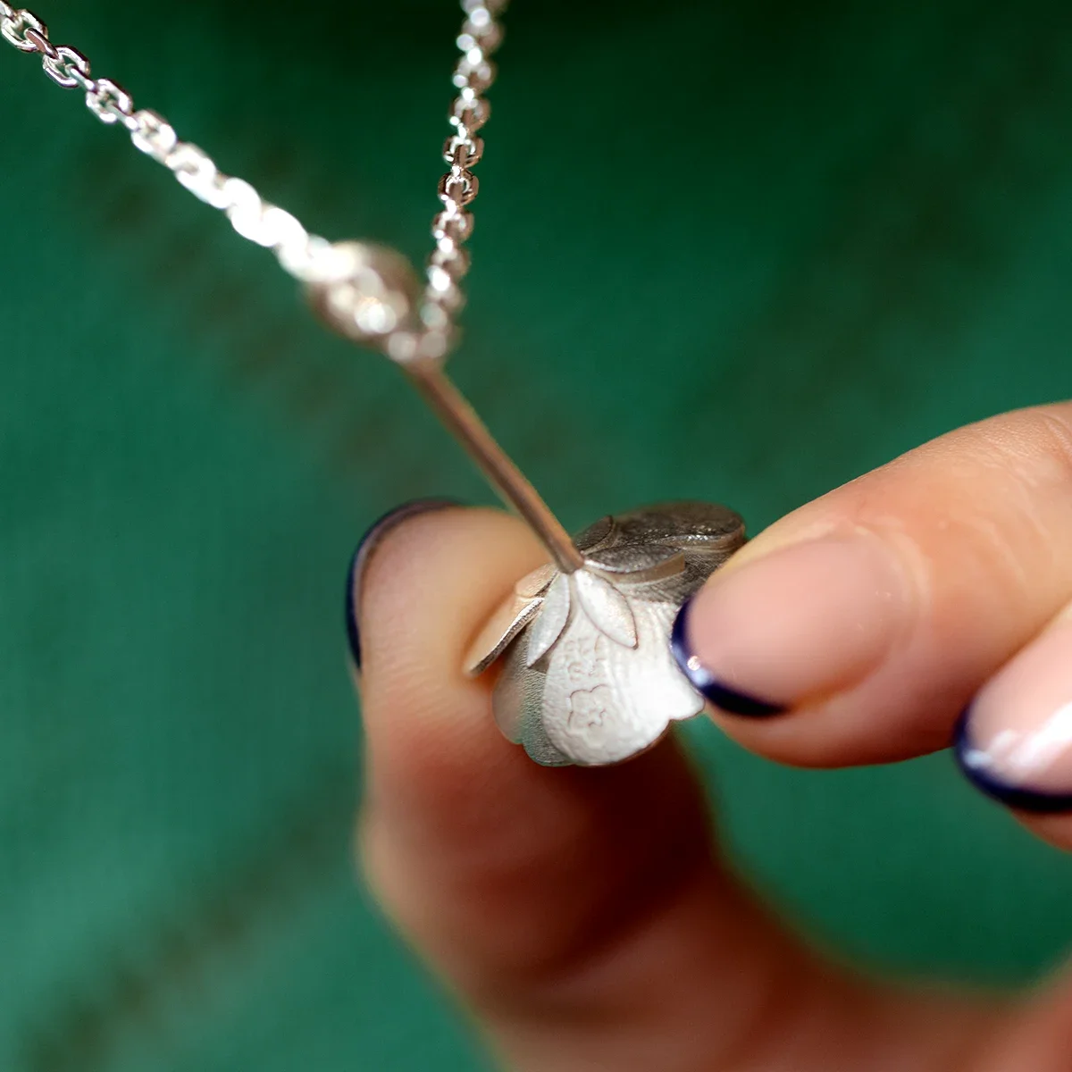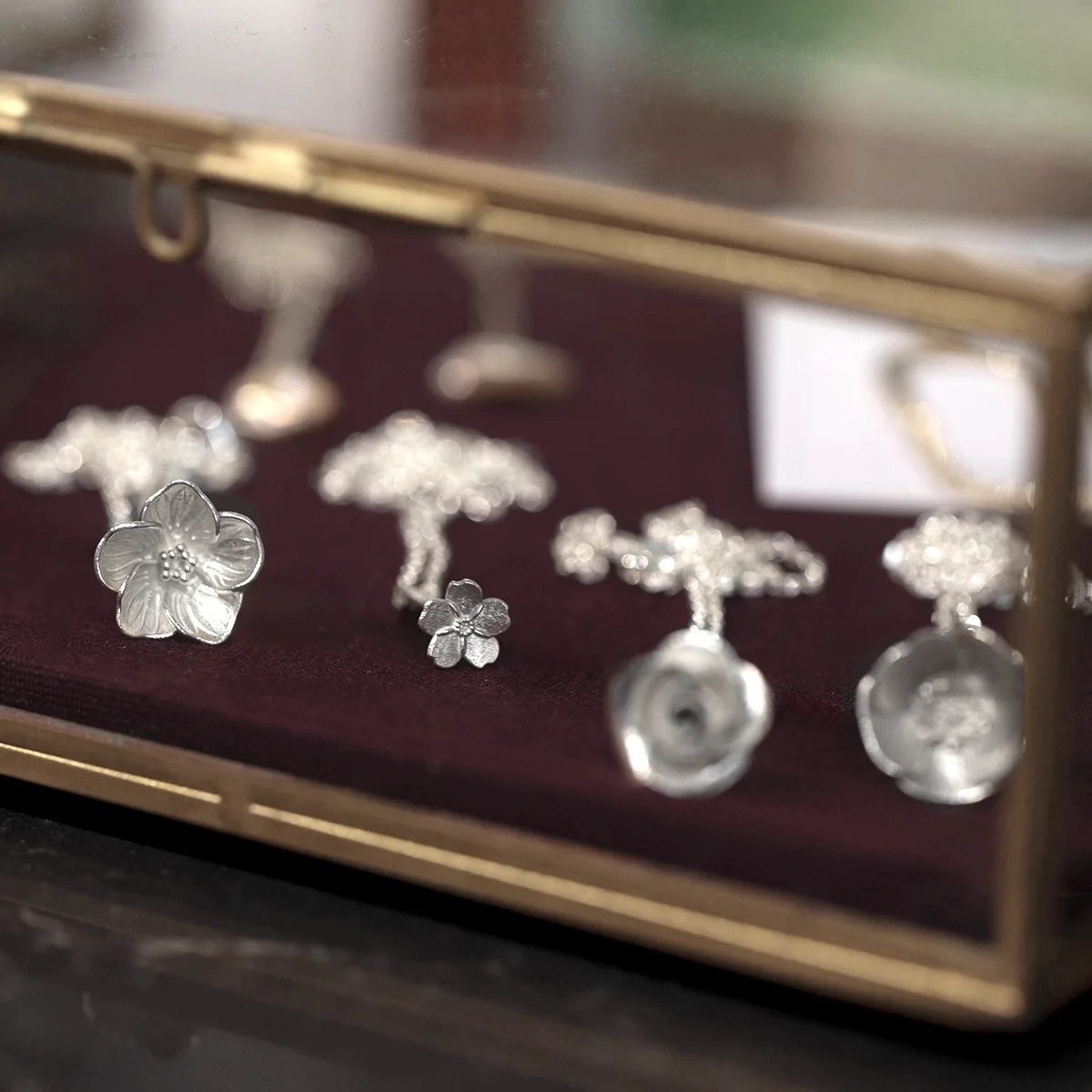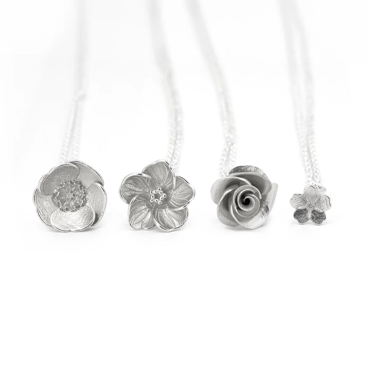 Cette collection célèbre la beauté fragile et précieuse des fleurs sauvages, transformées en bijoux à porter près du cœur. Choisissez une fleur sauvage et portez votre fleur comme un trésor. Chaque pendentif donne l’impression que la fleur, de taille réelle, vient tout juste d’être cueillie. Tournée vers le bas, la fleur invite celle ou celui qui la porte à la retourner pour en admirer toute la beauté.